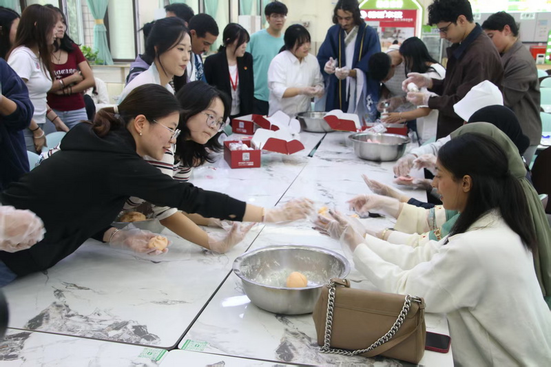 活动现场的互动区域同样热闹非凡,传统文化与现代趣味在此巧妙融合。中外学子围站桌前,在志愿者指导下揉面、包馅、压模,从笨拙尝试到熟练操作,一个个形态各异的月饼新鲜出炉,在亲手制作的过程中,“舌尖上的中国文化”变得可触可感。