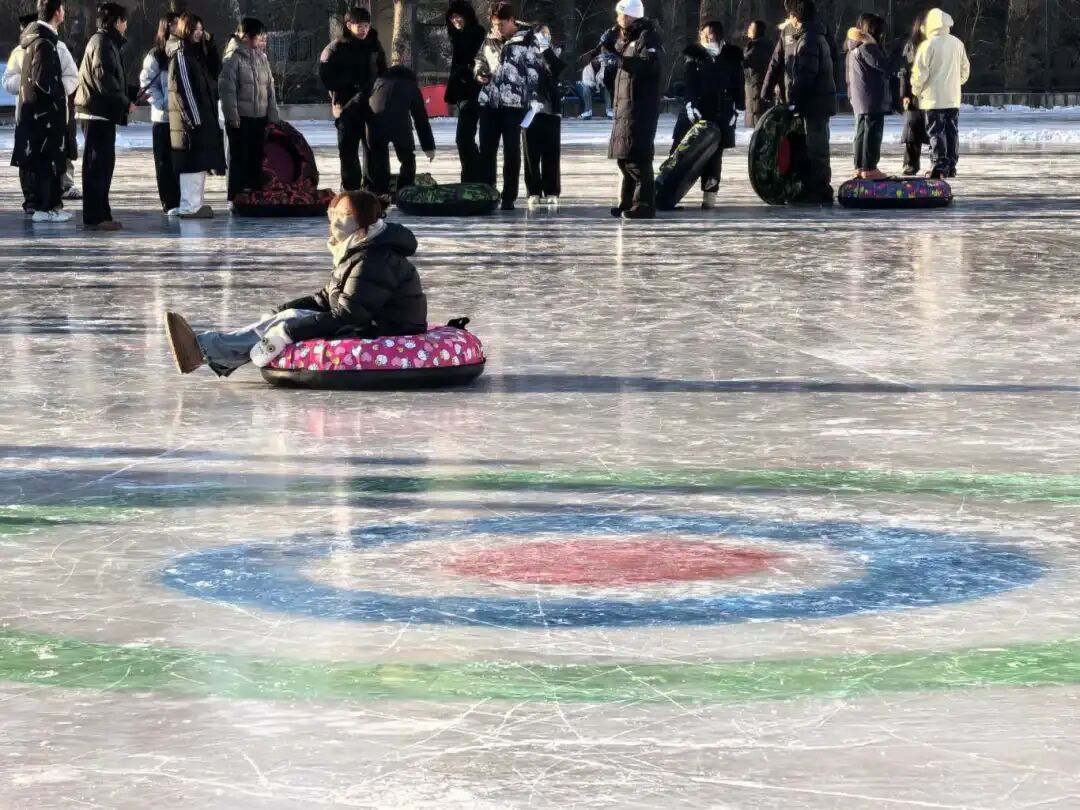比赛现场,各参赛队伍默契配合、巧思竞技:选手们以蹲姿或坐姿控制雪圈滑行,在冰面赛道上精准瞄准“圆心区”,欢呼声与助威声交织,在冬日冰场勾勒出活力满满的青春图景,尽显金院学子的协作智慧与运动热情。