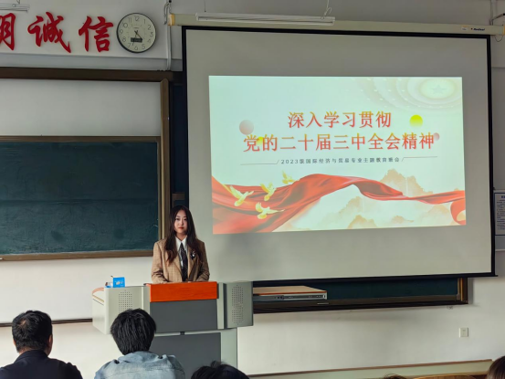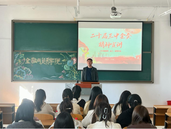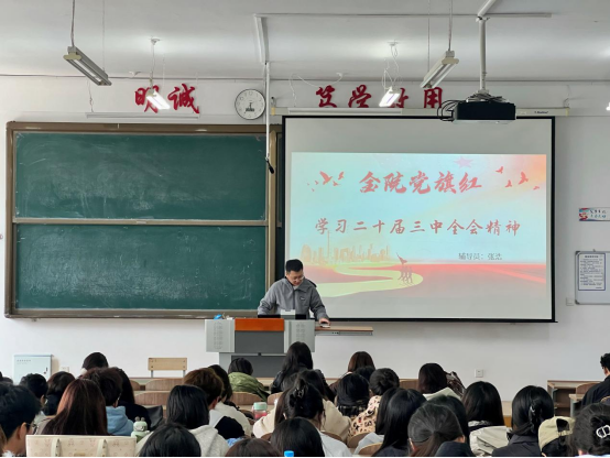 为贯彻落实《“金院党旗红”学工宣讲团党的二十届三中全会精神宣讲工作方案》要求,全面深入学习领会党的二十届三中全会精神,引导全体学生工作者和广大青年学生把思想和行动统一到党的二十届三中全会精神上来,找准在以中国式现代化全面推进强国建设、民族复兴伟业进程中的坐标和方位,把智慧和力量凝聚到实现新时代新征程党的中心任务和推动学校高质量发展上来,金融与贸易学院多措并举,通过领导干部带头讲、融合载体花式讲、结合青年实际讲等宣讲形式,掀起党的二十届三中全会精神宣传贯彻热潮。