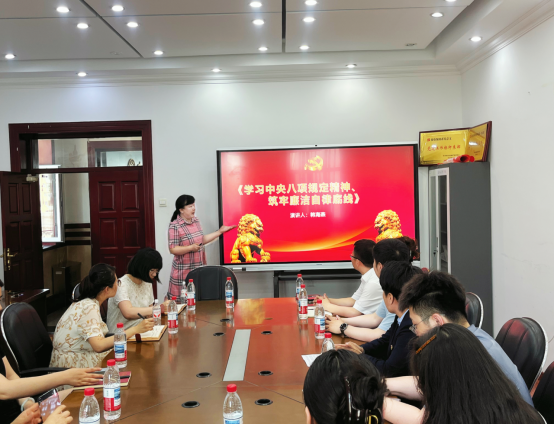6 月 24 日,双方支部联合举办“学习中央八项规定精神、筑牢廉洁自律底线” 专题党课,投资系党支部书记韩海燕担任主讲人。她从中央八项规定的政治意义、实施节点、违反表现及实践要求四个维度深入解读,提出 “常态化学习 + 行动落实” 双轨方案,强调要以纪律规矩为镜,对标自查、严守底线。