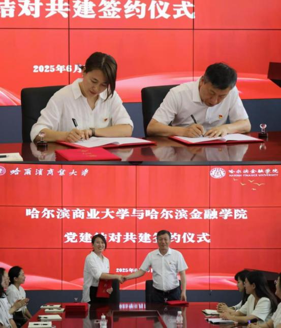 为庆祝中国共产党成立 104 周年,深入贯彻落实党的二十大、二十届三中全会精神,进一步加强基层党组织建设,创新党建工作模式,6月26下午,投资与保险学院与哈尔滨商业大学金融学院在哈尔滨商业大学0921会议室举行党建共建签约仪式。党总支书记郭蕾、金融学院党委书记吴晓光及双方党员代表共计 20余人出席活动。