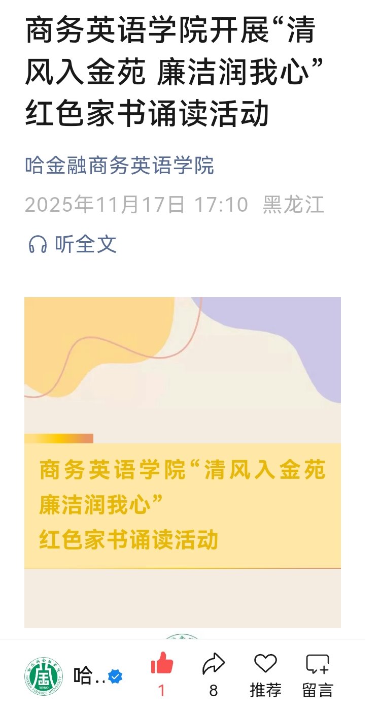 此次活动以红色家书为载体,引导学生从《夏明翰致母亲书》《聂荣臻元帅写给父母的信》等作品中感悟革命先辈的家国情怀与廉洁操守。活动共征集文稿、视频作品数十份,经评选,2023级商务英语3班王世凤、包家妮、赵美佳,2025级商务英语3班张嘉妮、崔佳慧、鄢欣悦、李明骁等同学的作品入选优秀作品。此次活动不仅是红色基因与廉洁文化的传承实践,更是以专业特色为纽带,让青年学生在语言表达与文化浸润中厚植崇廉尚洁的精神底色。