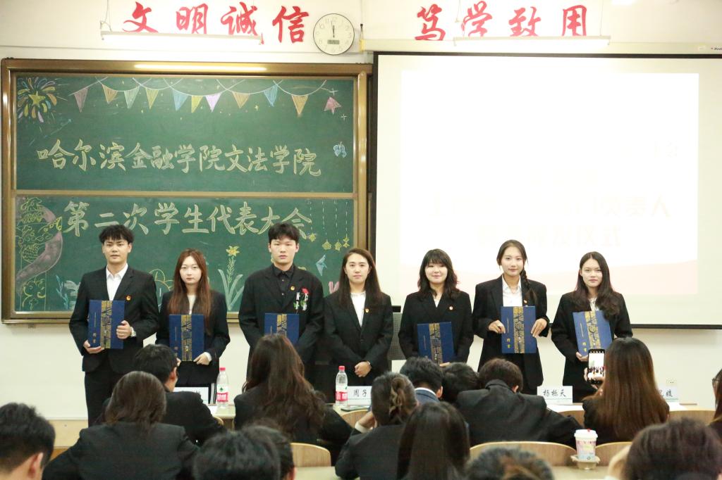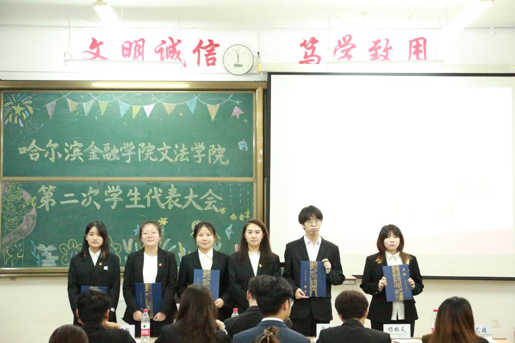 接下来,大会正式进入会议议程。由学生代表们依次上台,秉持公正公平的原则进行投票选举。此过程由监票人严格监督,计票人认真记录,以确保选举的公正性和透明度。最终,经过严谨的统计与审核,哈尔滨金融学院文法学院第二届学生会主席团的选举结果得以公布。本次当选的第二届学生会主席团成员分别是郭禹彤和段怡然。相信他们将带领文法学院的学子们踏上新的征程。