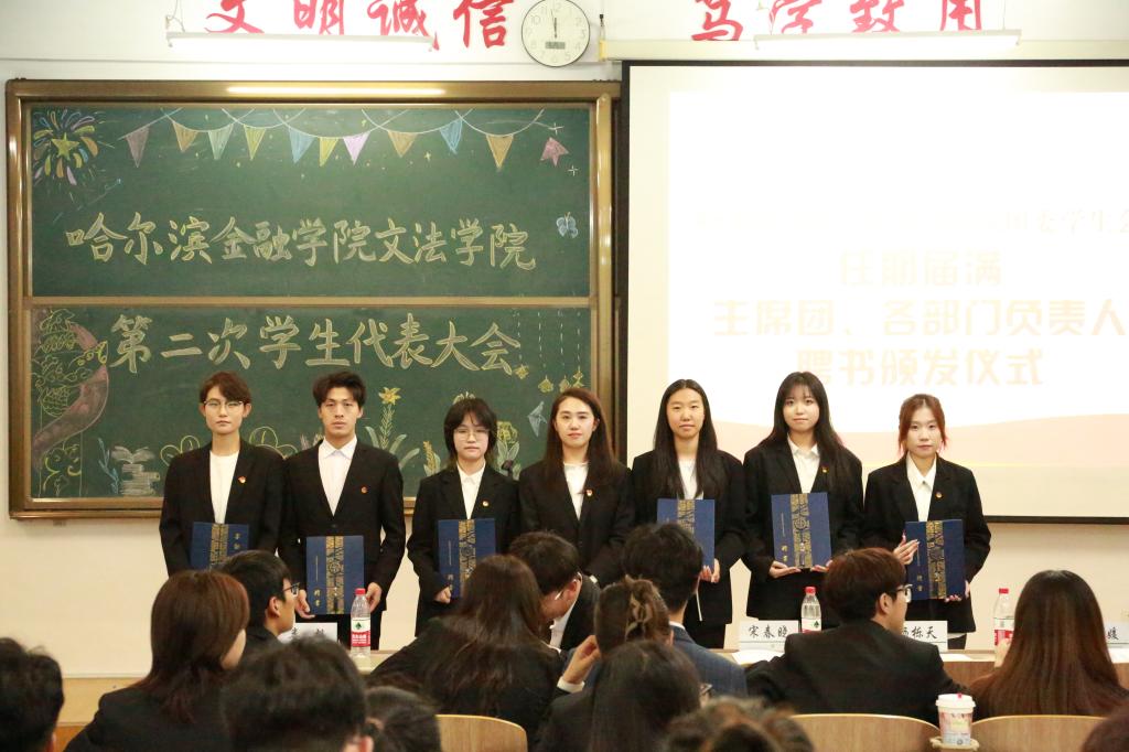 会议最后,由团委书记宋春晓老师逐一为上一届学生会部长及主席团成员颁发聘书,以此表彰他们在过去一年中为学院学生工作所做出的杰出贡献。他们感谢学院领导和同学们的信任和支持,并承诺将继续关注和支持文法学院的学生工作,为学院的繁荣发展贡献自己的力量。