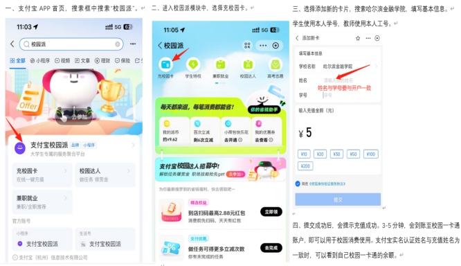 新生报到后,领取到校园“一卡通”后具体充值方式: